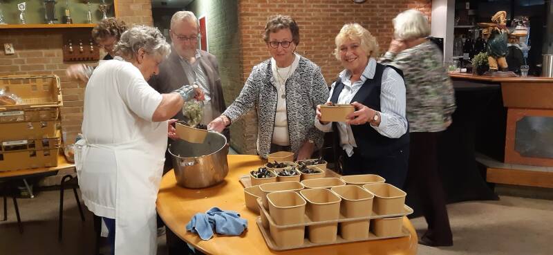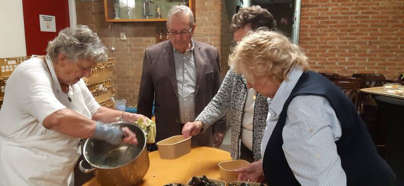 Inmiddels waren Hans, Tinus, en Bertus al aan het koken van de mosselen begonnen. Om de mosselen extra lekker te maken heeft Ria van der Ham een enorme hoeveelheid prij,ui en selderij gesneden. Je hebt je best gedaan Ria 👍. Even na acht uur kwamen de lekker gekookte mosselen uit de keuken en werden door een aantal dames verdeeld waarbij 3 soorten saus werd geserveerd met stokbrood. Sietse heeft vrijdag 160 kilo mosselen met de auto opgehaald uit Yerseke en afgeleverd bij de Duiventil waar het de koeling inging.